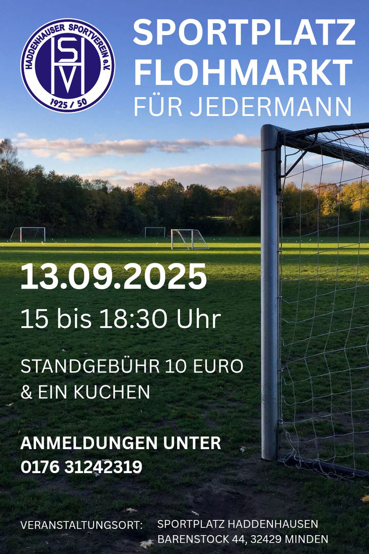 Am 13.09.2025 ist es endlich soweit: Auf dem Sportplatz in Haddenhausen findet zum ersten Mal unser großer Sportplatzflohmarkt für Jedermann